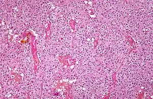 Low magnification micrograph of an oligodendroglioma showing the characteristic, small, branching, chicken wire-like blood vessels. H&E stain.