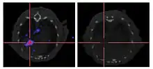 Adenoviral NIS gene expression in a mouse tumour (Located at the crosshairs) following intravenous delivery of virus (Left) compared to an uninfected control mouse (Right)