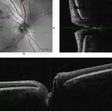 The optic disc is placed 3 to 4 mm to the nasal side of the fovea. It is a vertical oval, with average dimensions of 1.76mm horizontally by 1.92mm vertically.[2] There is a central depression, of variable size, called the optic cup. This depression can be a variety of shapes from a shallow indentation to a bean pot—this shape can be significant for diagnosis of some retinal disease.