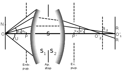 The largest opening of the pencils, which take part in the reproduction of O, i.e. the angle u, is generally determined by the margin of one of the lenses or by a hole in a thin plate placed between, before, or behind the lenses of the system. This hole is termed the stop or diaphragm; Abbe used the term aperture stop for both the hole and the limiting margin of the lens. The component S1 of the system, situated between the aperture stop and the object O, projects an image of the diaphragm, termed by Abbe the entrance pupil; the exit pupil is the image formed by the component S2, which is placed behind the aperture stop. All rays which issue from O and pass through the aperture stop also pass through the entrance and exit pupils, since these are images of the aperture stop. Since the maximum aperture of the pencils issuing from O is the angle u subtended by the entrance pupil at this point, the magnitude of the aberration will be determined by the position and diameter of the entrance pupil. If the system be entirely behind the aperture stop, then this is itself the entrance pupil (front stop); if entirely in front, it is the exit pupil (back stop).[6]