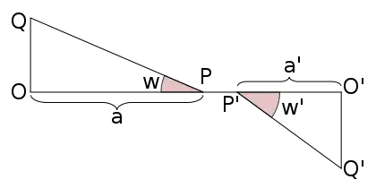 This aberration is quite distinct from that of the sharpness of reproduction; in unsharp, reproduction, the question of distortion arises if only parts of the object can be recognized in the figure. If, in an unsharp image, a patch of light corresponds to an object point, the center of gravity of the patch may be regarded as the image point, this being the point where the plane receiving the image, e.g., a focusing screen, intersects the ray passing through the middle of the stop. This assumption is justified if a poor image on the focusing screen remains stationary when the aperture is diminished; in practice, this generally occurs. This ray, named by Abbe a principal ray (not to be confused with the principal rays of the Gaussian theory), passes through the center of the entrance pupil before the first refraction, and the center of the exit pupil after the last refraction. From this it follows that correctness of drawing depends solely upon the principal rays; and is independent of the sharpness or curvature of the image field. Referring to fig. 4, we have O'Q'/OQ = a' tan w'/a tan w = 1/N, where N is the scale or magnification of the image. For N to be constant for all values of w, a' tan w'/a tan w must also be constant. If the ratio a'/a be sufficiently constant, as is often the case, the above relation reduces to the condition of Airy, i.e. tan w'/ tan w= a constant. This simple relation (see Camb. Phil. Trans., 1830, 3, p. 1) is fulfilled in all systems which are symmetrical with respect to their diaphragm (briefly named symmetrical or holosymmetrical objectives), or which consist of two like, but different-sized, components, placed from the diaphragm in the ratio of their size, and presenting the same curvature to it (hemisymmetrical objectives); in these systems tan w' / tan w = 1.[6]