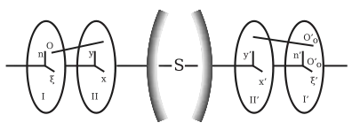 A ray proceeding from an object point O (fig. 5) can be defined by the coordinates (ξ, η). Of this point O in an object plane I, at right angles to the axis, and two other coordinates (x, y), the point in which the ray intersects the entrance pupil, i.e. the plane II. Similarly the corresponding image ray may be defined by the points (ξ', η'), and (x', y'), in the planes I' and II'. The origins of these four plane coordinate systems may be collinear with the axis of the optical system; and the corresponding axes may be parallel. Each of the four coordinates ξ', η', x', y' are functions of ξ, η, x, y; and if it be assumed that the field of view and the aperture be infinitely small, then ξ, η, x, y are of the same order of infinitesimals; consequently by expanding ξ', η', x', y' in ascending powers of ξ, η, x, y, series are obtained in which it is only necessary to consider the lowest powers. It is readily seen that if the optical system be symmetrical, the origins of the coordinate systems collinear with the optical axis and the corresponding axes parallel, then by changing the signs of ξ, η, x, y, the values ξ', η', x', y' must likewise change their sign, but retain their arithmetical values; this means that the series are restricted to odd powers of the unmarked variables.[6]