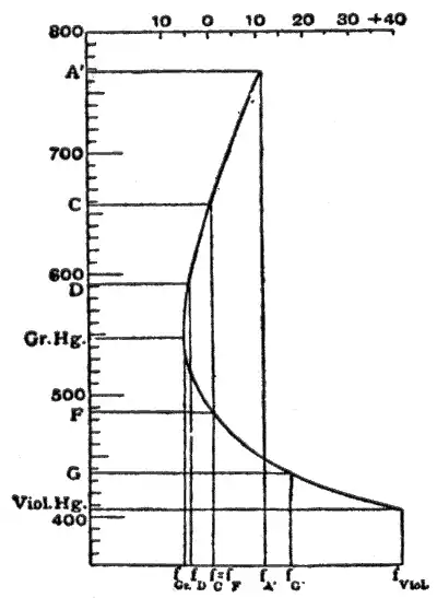 In fig. 6, taken from M. von Rohr's Theorie und Geschichte des photographischen Objectivs, the abscissae are focal lengths, and the ordinates wavelengths. The Fraunhofer lines used are shown in adjacent table.[6]