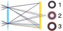 Comparison of an ideal image of a ring (1) and ones with only axial (2) and only transverse (3) chromatic aberration