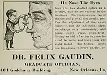 "He Nose The Eyes". 1910 advertisement for Dr. Felix Gaudin, "Graduate Optician", New Orleans