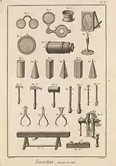 Plate illustrating opticians' tools and the products of their work, including spectacles and a spyglass