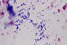- Staphylococcus aureus is a gram-positive bacterium, which is the most common cause of staphylococcal infections. Staphylococcus aureus infection can spread from the skin to the orbit. This organism is able to produce toxins which promotes its virulence, leading to the inflammatory response seen in orbital cellulitis. Staphylococcus infections are identified by a cluster arrangement on gram stain. Staphylococcus aureus forms large yellow colonies when cultured (which is distinct from other Staph infections such as Staphylococcus epidermidis, which forms white colonies).