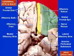 The inferior or orbital surface of the frontal lobe is concave, and rests on the orbital plate of the frontal bone. It is divided into four orbital gyri by a well-marked H-shaped orbital sulcus. These are named, from their position, the medial, anterior, lateral, and posterior, orbital gyri. The medial orbital gyrus presents a well-marked antero-posterior sulcus, the olfactory sulcus, for the olfactory tract; the portion medial to this is named the straight gyrus, and is continuous with the superior frontal gyrus on the medial surface.