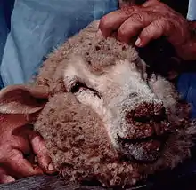 It has been recorded since the late 19th century and has been reported from most sheep-or goat-raising areas, including those in Europe, the Middle East, the United States, Africa, Asia, South America, Canada, New Zealand and Australia.[3] Orf is spread by fomites and direct contact. In some environments, infection is injected by scratches from thistles[1] of both growing and felled plants. Symptoms include papules and pustules on the lips and muzzle, and less commonly in the mouth of young lambs and on the eyelids, feet, and teats of ewes. The lesions progress to thick crusts which may bleed. Orf in the mouths of lambs may prevent suckling and cause weight loss, and can infect the udder of the mother ewe, thus potentially leading to mastitis.[1] Sheep are prone to reinfection.[4] Occasionally the infection can be extensive and persistent if the animal does not produce an immune response.[1]