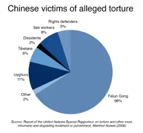 Former Chinese prisoners have also reported that Falun Gong practitioners consistently received the "longest sentences and worst treatment" in the camps, and that they are singled out for torture and abuse.[40][91] In 2006, a study by the UN's Special Rapporteur on Torture noted that 66% of reported cases from China involved Falun Gong victims.[92] Thousands of Falun Gong practitioners have died or been killed in custody, often under disputed circumstances.[35][40] Family members of the deceased have reported being denied an autopsy;[93] in some instances bodies were summarily cremated without the family's consent.[94] Analysts and rights groups have pointed to several factors that drive the especially severe treatment against Falun Gong practitioners in custody. These include directives issued from central government or Communist Party authorities;[95] incentives and quota systems that encourage abuse;[40] a sense of impunity in the event of deaths in custody;[96] and the effects of the state propaganda that dehumanizes and vilifies Falun Gong practitioners.[39][97]