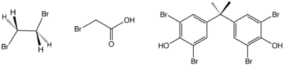 Structure of three industrially significant organobromine compounds. From left: ethylene bromide, bromoacetic acid, and tetrabromobisphenol-A.
