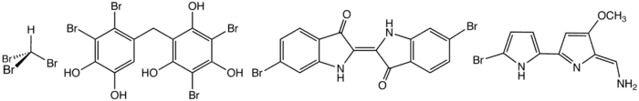 Structure of some naturally-occurring organobromine compounds. From left: bromoform, a brominated bisphenol, dibromoindigo (Tyrian purple), and the antifeedant tambjamine B.