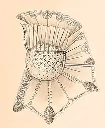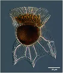 Ornithocercus is a genus of planktonic dinoflagellate that is known for its complex morphology that features considerable lists growing from its thecal plates, giving an attractive appearance.[2] Discovered in 1883, this genus has a small number of species currently categorized but is widespread in tropical and sub-tropical oceans.[3] The genus is marked by exosymbiotic bacteria gardens under its lists, the inter-organismal dynamics of which are a current field of research.[4] As they reside only in warm water, the genus has been used as a proxy for climate change and has potential to be an indicator species for environmental change if found in novel environments.[5]