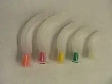 An oropharyngeal airway (also known as an oral airway, OPA or Guedel pattern airway) is a medical device called an airway adjunct used to maintain or open a patient's airway. It does this by preventing the tongue from covering the epiglottis, which could prevent the person from breathing. When a person becomes unconscious, the muscles in their jaw relax and allow the tongue to obstruct the airway.[1]