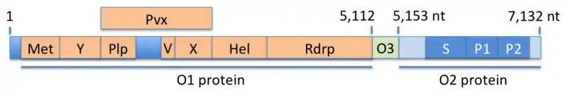 The viral genome is a single strand of positive-sense RNA that is about 7200 bases in length. The three open-reading frames (ORF1, ORF2 and ORF3) encode for three proteins (O1, O2, O3), two of which are polyproteins, that is, they are cleaved into fragments which carry out the actual functions of the virus (see figure). The O1 protein consists of seven such fragments, namely Met (methyltransferase), Y (Y-domain), Plp (papain-like protease), V (proline-rich variable region), X (X-domain, macro-domain), Hel (helicase), and Rdrp (RNA-dependent RNA polymerase). The Pvx domain is a fusion protein consisting of the Plp, V, and X domains. The O3 protein is encoded by a single open-reading frame (ORF3). The O2 protein encodes the capsid, which is composed of three domains, namely the shell domain (S) and two protruding domains (P1, P2).[7] Numbers in the figure indicate positions in the RNA sequence.