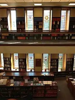 Percy Erskine Nobbs designed the Osler library for the Strathcona Medical Building[2] (now the Strathcona Anatomy and Dentistry Building), and the library officially opened there in May 1929. In 1965, both the contents of the library and the interior oak paneling and shelving were moved to their present location within the newly built McIntyre Medical Sciences Building. At that time the "Wellcome Camera" was added to the library with the financial assistance of the Wellcome Trust. Initially most of the windows on the first floor of the Camera were provided with stained-glass coats-of-arms; one for each of the twelve Canadian universities which then had medical faculties. In 1985 four additional coats-of-arms were added; only the coat-of-arms of the Northern Ontario School of Medicine is currently missing.[3] The Osler Library was further expanded and renovated in 2001-02 and in 2014. In summer 2018 the roof terrace above the library caught fire. Though the library and archives were not harmed by fire, the area suffered water damage and the collection was moved to McGill's McLennan-Redpath Library complex while the building undergoes repairs. As of December 2018 it is uncertain when (or if) the collection will return to the McIntyre Building.