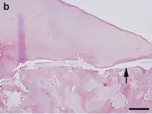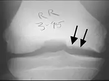 Osteochondritis dissecans (OCD or OD) is a joint disorder primarily of the subchondral bone in which cracks form in the articular cartilage and the underlying subchondral bone.[1] OCD usually causes pain during and after sports. In later stages of the disorder there will be swelling of the affected joint which catches and locks during movement. Physical examination in the early stages does only show pain as symptom, in later stages there could be an effusion, tenderness, and a crackling sound with joint movement.