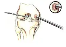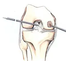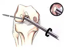 In attempts to address the weaker structure of the reparative fibrocartilage, new techniques have been designed to fill the defect with tissue that more closely simulates normal hyaline articular cartilage. One such technique is autologous chondrocyte implantation (ACI), which is useful for large, isolated femoral defects in younger people. In this surgery, chondrocytes are arthroscopically extracted from the intercondylar notch of the articular surface. The chondrocytes are grown and injected into the defect under a periosteal patch. ACI surgery has reported good to excellent results for reduced swelling, pain and locking in clinical follow-up examinations.[58][59] However, some physicians have preferred to use undifferentiated pluripotential cells, such as periosteal cells and bone marrow stem cells, as opposed to chondrocytes. These too have demonstrated the ability to regenerate both the cartilage and the underlying subchondral bone.[60]
