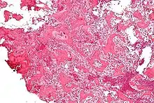 On histological examination, osteoid osteoma consists of a small (< 1.52 cm), yellowish-to-red nidus of osteoid and woven bone with interconnected trabeculae, and a background and rim of highly vascularized, fibrous connective tissue. Varying degrees of sclerotic bone reaction may surround the lesion. Benign osteoblastoma is virtually indistinguishable from osteoid osteoma. The usual appearance included a fibrovascular stroma with numerous osteoblasts, osteoid tissue, well-formed woven bone, and giant cells. The osteoblasts were generally small and regular in shape.[7]