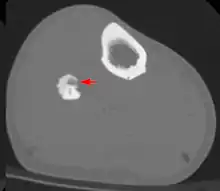 Recently, CT guided radiofrequency ablation has emerged as a less invasive alternative to surgical resection. In this technique, which can be performed under conscious sedation, an RF probe is introduced into the tumor nidus through a cannulated needle under CT guidance and heat is applied locally to destroy tumor cells. Since the procedure was first introduced for the treatment of osteoid osteomas in the early 1990s,[12] it has been shown in numerous studies to be less invasive and expensive, to result in less bone destruction and to have equivalent safety and efficacy to surgical techniques, with 66 to 96% of patients reporting freedom from symptoms.[13][14][15] While initial success rates with RFA are high, symptom recurrence after RFA treatment has been reported, with some studies demonstrating a recurrence rate similar to that of surgical treatment.[16] As of July 17, 2014, treatment with incisionless surgery utilizing an MRI to guide high-intensity ultrasound waves to destroy a benign bone tumor in the leg has been demonstrated.[17]