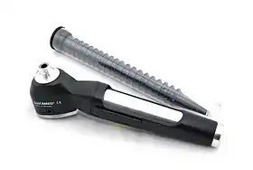 An otoscope or auriscope is a medical device which is used to look into the ears.[1] Health care providers use otoscopes to screen for illness during regular check-ups and also to investigate ear symptoms. An otoscope potentially gives a view of the ear canal and tympanic membrane or eardrum. Because the eardrum is the border separating the external ear canal from the middle ear, its characteristics can be indicative of various diseases of the middle ear space. The presence of earwax (cerumen), shed skin, pus, canal skin edema, foreign body, and various ear diseases can obscure any view of the eardrum and thus severely compromise the value of otoscopy done with a common otoscope.
