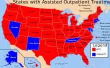 In the United States the term "assisted outpatient treatment" (AOT) is often used and refers to a process whereby a judge orders a qualifying person with symptoms of severe untreated mental illness to adhere to a mental health treatment plan while living in the community. The plan typically includes medication and may include other forms of treatment as well.[1] Patients are often monitored and assigned to case managers or a community dedicated to treating mental health known as assertive community treatment (ACT).[2]