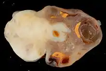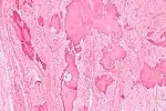 | Low magnification micrograph of a calcified ovarian fibroma in the context of nevoid basal cell carcinoma syndrome. H&E stain. | |