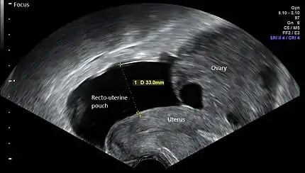 ![]() ![]() Vaginal ultrasonography in the sagittal plane in a woman with mild OHSS, showing a 33 mm wide anechogenic area behind the uterus in the recto-uterine pouch, which means there was ascites, that is, free fluid in the peritoneal cavity. Normally, there is up to 5 ml of fluid in the recto-uterine pouch,[5] corresponding approximately to an area up to 10 mm wide. The ovary measured up to 6.5 cm in diameter. |