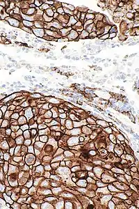 In the cancer disease state, the interaction of PD-L1 on the tumor cells with PD-1 on a T-cell reduces T-cell function signals to prevent the immune system from attacking the tumor cells.[9] Use of an inhibitor that blocks the interaction of PD-L1 with the PD-1 receptor can prevent the cancer from evading the immune system in this way.[9] Several PD-1 and PD-L1 inhibitors are being trialled within the clinic for use in advanced melanoma, non-small cell lung cancer, renal cell carcinoma, bladder cancer and Hodgkin lymphoma, amongst other cancer types.[5][10]