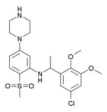 PRX-07034 is a selective 5-HT6 receptor antagonist.[1] It has cognition and memory-enhancing properties and potently decreases food intake and body weight in rodents.[1][2][3][4] PRX-07034 was under development by Epix Pharmaceuticals for the treatment of obesity and cognitive impairment associated with Alzheimer's disease and schizophrenia but upon the company collapsing due to lack of funds the compound was auctioned to another corporation.[5][6][7]