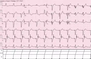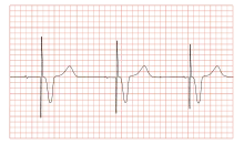 | Ventricular pacemaker with 1:1 retrograde ventriculoatrial (V-A) conduction to the atria (arrows). | |