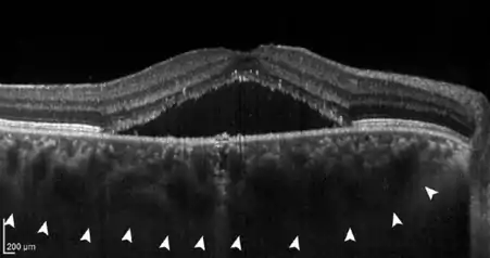 - In all stages, focal choroidal excavation may occur, which probably represents a contraction of the choroid due to scarring processes.[7]