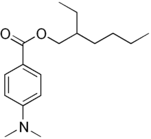 Padimate O is an organic compound related to the water-soluble compound PABA (4-aminobenzoic acid) that is used as an ingredient in some sunscreens. This yellowish water-insoluble oily liquid is an ester formed by the condensation of 2-ethylhexanol with dimethylaminobenzoic acid. Other names for padimate O include 2-ethylhexyl 4-dimethylaminobenzoate, Escalol 507, octyldimethyl PABA, and OD-PABA.