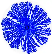 | Figure 1: A colony generated by the Branching (Tip splitting) morphotype bacteria of P. dendritiformis. The colony diameter is 6cm and the colors indicate the bacteria density (darker shade for higher density). | |
