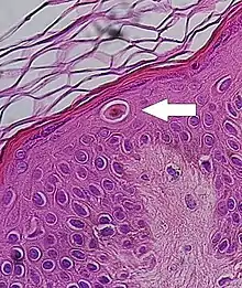Pagetoid is a term used in dermatology to refer to "upward spreading" of abnormal cells in the epidermis (ie from bottom to top). It is uncommon and a possible indication of a precancerous or cancerous condition. Cells display pagetoid growth when they invade the upper epidermis from below. Squamous cell carcinoma, melanoma in situ, Pagetoid Bowen's disease, ocular sebaceous carcinoma, and other carcinomas can all display pagetoid growth.