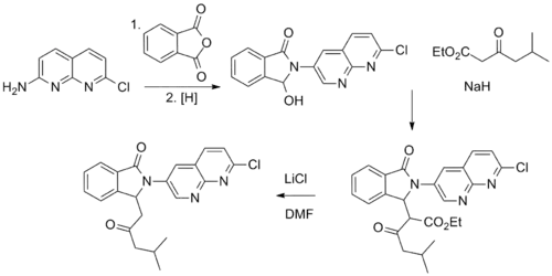 Reaction of 2-Amino-7-chloro-1,8-naphthyridine with phthalic anhydride leads to the corresponding phthalimide. Selective reduction of one of the imide carbonyl groups give the corresponding alcohol. Reaction with the carbanion from Ethyl 5-methyl-3-oxohexanoate leads to the product from the displacement of the hydroxyl group; 'this too may proceed via the acrylate obtained from aldol reaction of the ring opened imidal'.