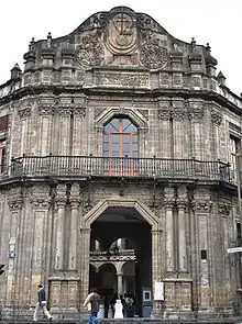 After the end of the Inquisition, in 1838, it was put up for sale by public auction, but no one offered the minimum price. It was finally purchased by the archbishopric.[1] Later it served as lottery offices, a primary school and a military barracks.[3] In 1854, it was sold to the School of Medicine, which at the time was offering classes in professors' homes. After the purchase, a number of changes were made, and a boarding school created here.[1] Eventually, it would become the school of medicine and nursing of the National University (today's UNAM)[3] In 1873, in despair over an unrequited love, romantic poet Manuel Acuña committed suicide by poison in a room here.[1] In 1879, after modification, the old chapel became the Academy of Medicine and a third floor was added, which resulted in the removal of the crest which held the coat-of-arms of the Inquisition.[1]