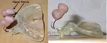 A palatal obturator is a prosthesis that totally occludes an opening such as an oronasal fistula (in the roof of the mouth). They are similar to dental retainers, but without the front wire. Palatal obturators are typically short-term prosthetics used to close defects of the hard/soft palate that may affect speech production or cause nasal regurgitation during feeding. Following surgery, there may remain a residual orinasal opening on the palate, alveolar ridge, or vestibule of the larynx. A palatal obturator may be used to compensate for hypernasality and to aid in speech therapy targeting correction of compensatory articulation caused by the cleft palate. In simpler terms, a palatal obturator covers any fistulas (or "holes") in the roof of the mouth that lead to the nasal cavity, providing the wearer with a plastic/acrylic, removable roof of the mouth, which aids in speech, eating, and proper air flow.