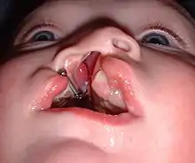 A palatal plate is a prosthetic device, generally consisting of an acrylic plate and retention clasps of orthodontic wire, which covers a fistula of the palate. It may be used to aid in improving articulation and feeding. The blockage of the opening helps improve hypernasality and suckling ability for babies. In the case of a labial-oral-nasal fistula, the plate may include an anterior upward extension to fully occlude the passageway running between the labial surface of the alveolus, alveolus, and nasal cavity. The plate may be constructed to include any congenitally missing teeth to improve articulation and appearance. Individuals who use palatal plates must be monitored periodically by their dental professionals due to possible tissue irritation by the plate. Materials such as food particles, oral mucosa and secretions may cause buildup on the upper surface of the plate; therefore, it is essential to clean a palatal obturator at least twice a day to avoid tissue irritation. There are also more specific terms used for obturators depending on their time and purpose of use: Photo Examples of the Latham Device or the Nasal Alveolar are prime examples for use in Cleft Palate Deformities.