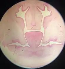 ![]() Frontal section of nasal cavities of a human embryo 28 mm. long (Kollmann) at about forty-four days. The two palatine processes can be seen here post-elevation in a horizontal position. The medial edges of the palatine processes are yet to fuse and form the roof of the oral cavity. | |
