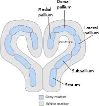 The general layout or body plan of the pallium is already clearly defined in animals with relatively simple brains, including lampreys, sharks and amphibians. In teleost fish, reptiles, birds, and mammals, the pallial architecture is greatly modified (sharply divergently in fish), with differential growth and specialization of diverse sectors of the conserved pallial Bauplan. In all vertebrate brains, the telencephalic forebrain consists of two hemispheres, joined at the midline by a region called the septum. The septum is continuous with the preoptic area across the plane defined by the anterior commissure; it is largely subpallial, but also contains a small pallial portion, where the hippocampal commissure forms, which is contiguous to the medial pallium. The telencephalic part of the rostral choroidal tela (roof plate continuous caudally with a diencephalic part) is inserted at the back of this commissure at a locus where mammals show the subfornical circumventricular organ, and extends laterally over the interventricular foramen into a wing-shaped medial telencephalic territory, the so-called choroidal fissure. Here the choroidal tissue is attached to the fimbria of the hippocampus (also known as the cortical hem area), bordering lengthwise the medial pallium. At its rostral and caudal ends, the medial pallium contacts the ventral pallium, which builds the pallial portion that contacts the subpallium across the pallio subpallial boundary, observed at the lateral telencephalic wall. Inside the ring formed thus by the medial and ventral pallium there is a sort of island that contains the dorsal and lateral pallial portions. In older literature the pallium used to be subdivided only into three zones, called the medial pallium, dorsal (or dorsolateral) pallium, and lateral pallium. The old lateral pallium encompassed the modern lateral and ventral parts of the pallium. The medial pallium is the progenitor of the mammalian hippocampus, and is thought to be involved in spatial cognitive mapping and memory formation across a broad range of species. The lateral and ventral pallium is the progenitor of the mammalian piriform cortex, and has an olfactory function in every species in which it has been studied. The evolutionary diversifications and specialization in functions of the dorsal pallium have been more difficult to decipher. It is widely believed to be the progenitor of the bulk of the mammalian cerebral cortex, although the evidence for this is considered by some anatomists not yet to be conclusive.[2]