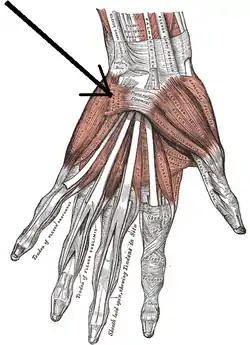 Palmaris brevis muscle is located on the ulnar side of the hand.[1][2] It arises from the tendinous fasciculi from the transverse carpal ligament and palmar aponeurosis. The muscle fibres are inserted into the skin on the ulnar border of the palm of the hand,[1] and occasionally on the pisiform bone.[3]