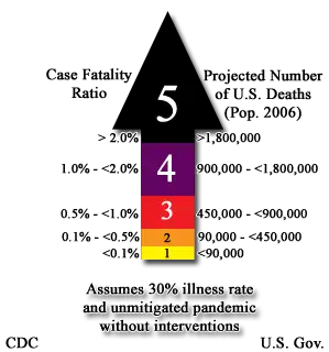 The analogy of "category" levels were introduced to provide an understandable connection to hurricane classification schemes, with specific reference to the recent aftermath of Hurricane Katrina.[5][8] Like the Saffir–Simpson Hurricane Scale, the PSI ranges from 1 to 5, with Category 1 pandemics being most mild (equivalent to seasonal flu) and level 5 being reserved for the most severe "worst-case" scenario pandemics (such as the 1918 Spanish flu).[3][5]