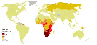 Although the WHO uses the term "global epidemic" to describe HIV ("WHO HIV/AIDS Data and Statistics". Retrieved 12 April 2020.), as HIV is no longer an uncontrollable outbreak outside of Africa, some authors use the term "pandemic".[37] HIV originated in Africa, and spread to the United States via Haiti between 1966 and 1972.[38] AIDS is currently a pandemic in Africa, with infection rates as high as 25% in some regions southern and eastern Africa. In 2006, the HIV prevalence among pregnant women in South Africa was 29%.[39] Effective education about safer sexual practices and bloodborne infection precautions training have helped to slow down infection rates in several African countries sponsoring national education programs. As of 2018, there have been millions of infections of HIV/AIDS and about 32-35 million deaths related to HIV.