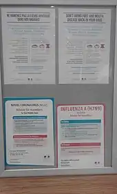 A key part of managing an infectious disease outbreak is trying to decrease the epidemic peak, known as "flattening the curve".[26][29] This helps decrease the risk of health services being overwhelmed and provides more time for a vaccine and treatment to be developed.[26][29] A broad group of the so-called non-pharmaceutical interventions may be taken to manage the outbreak.[29] In a flu pandemic, these actions may include personal preventive measures such as hand hygiene, wearing face-masks, and self-quarantine; community measures aimed at social distancing such as closing schools and canceling mass gatherings; community engagement to encourage acceptance and participation in such interventions; and environmental measures such as cleaning of surfaces.[27]