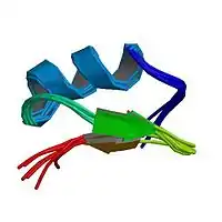 PiTX-Kα and PiTX-Kβ are 35-residue peptides, which are found to have an α-helix from residues 10 to 21 and two β-sheets (β 1 is from residues 26-28, β 2 is from residues 33-35). One face of the α-helix is anchored to the β-sheet by three disulfide bonds which are conserved in all members of the charybdotoxin family (R-K toxins).[1] PiTX-K α and PiTX-K β have only two β-sheets whereas other members of the family have three additional amino acid residues at the N-terminal portion, which forms a third β-sheet.[1]