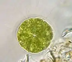 Pandorina is a genus of green algae composed of 8, 16, or sometimes 32 cells, held together at their bases to form a sack globular colony surrounded by mucilage. The cells are ovoid or slightly narrowed at one end to appear keystone- or pear-shaped. Each cell has two flagella with two contractile vacuoles at their base, an eyespot, and a large cup-shaped chloroplast with at least one pyrenoid.