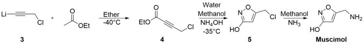 McCarry’s synthesis is a three step synthesis involving a lithium acetylide produced from propargyl chloride. The acetylide (3), was dissolved in ether, cooled to -40°C, and treated with excess propargyl chloride to afford ethyl 4-chlorotetrolate (4) in a 70% yield. (4) was then added to a solution of water, methanol and hydroxylamine at -35°C . At a pH of between 8.5 and 9, the isoxazole (5) was recovered in a 41% yield. Muscimol was formed in a 65% yield when (5) was dissolved in a saturated solution of methanol and anhydrous ammonia and heated from 0°C to 50°C. The total yield was 18.7%.[32]