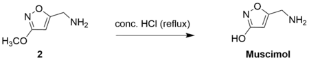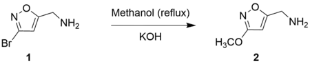 Muscimol was synthesized in 1965 by Gagneux,[27] who utilized a bromo-isoxazole starting material in a two step reaction. 3-bromo-5-aminomethyl-isoxazole (1) was refluxed in a mixture of Methanol and Potassium Hydroxide for 30 hours, resulting in 3-methoxy-5-aminomethyl-isoxazole (2) with a yield of 60%.