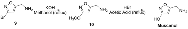 (9) was then refluxed with potassium hydroxide in methanol to generate 5-Aminomethyl-3-methoxyisoxazole (10) with a 66% yield. Subsequent reflux of (10) with hydrobromic acid and acetic acid generated muscimol with a yield of 62%. The overall synthetic yield was 30%.[34]